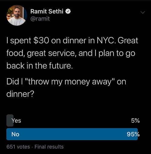 Not surprisingly, 95% of people said, “No, you didn’t ‘throw money away’ on a nice meal.”